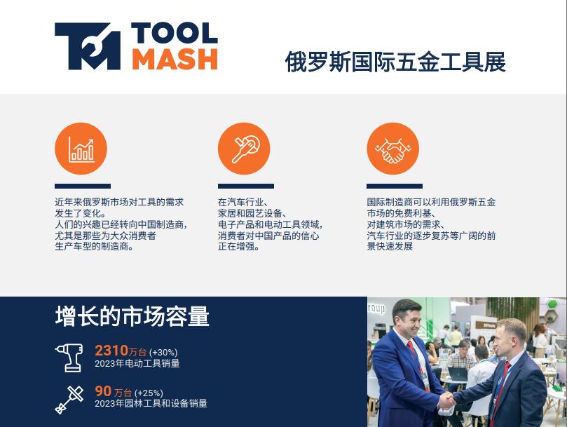俄羅斯國(guó)際五金展覽會(huì)Toolmash是由世界著名展覽公司英國(guó)國(guó)際貿(mào)易與展覽有限公司ITE Group Plc主辦,一年一屆在俄羅斯舉行,是一個(gè)五金制品及工具、花園工具的專(zhuān)項(xiàng)展覽會(huì),該展是在俄羅斯及東歐地區(qū)具有較強(qiáng)影響力的專(zhuān)業(yè)展會(huì)。